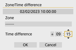 izberite možnost [Time difference/Časovna razlika] (+–/ura/minuta), nato pritisnite gumb