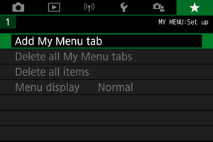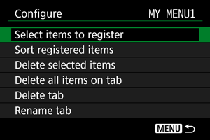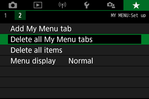 Izbrišete lahko vsa polja menija Moj meni, ki ste jih oblikovali. Če izberete [Delete all My Menu tabs/Izbris vseh polj menija Moj meni], bodo vsa polja od [MY MENU1/MOJ MENI1] do [MY MENU5/MOJ MENI5] izbrisana in polje [] se bo vrnilo na privzeto nastavitev.