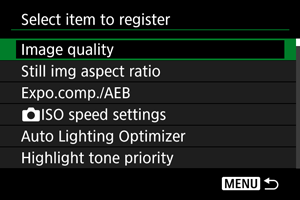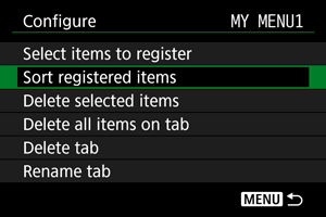 Spremenite lahko zaporedje registriranih postavk v okviru My Menu/Moj meni. Izberite [Sort registered items/Razvrstitev registriranih postavk], izberite postavko za prerazporeditev, nato pritisnite gumb . Ko je prikazano [