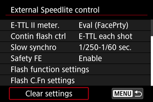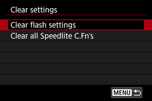 - Izberite [Clear flash settings/Izbris nastavitev bliskavice] ali [Clear all Speedlite C.Fn's/Izbris vseh C.Fn funkcij za Speedlite].