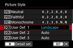 - Če je stil slike že registriran pod [User Def. */Upor. določeno *], bo sprememba osnovnega stila slike povzročila izbris nastavitev parametra predhodno registriranega uporabniškega stila slike.