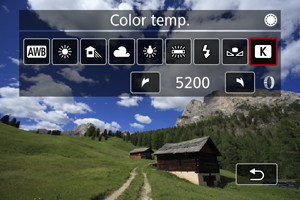 ] na vrednost, izmerjeno z merilnikom barvne temperature, na voljo v trgovinah, zajemite vnaprej nekaj preizkusnih posnetkov in po potrebi prilagodite nastavitev, da popravite morebitno razliko med izmerjeno vrednostjo z merilnikom barvne temperature in fotoaparatom.