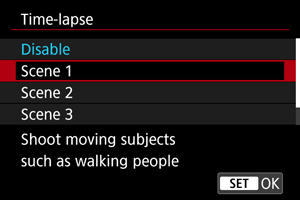 - Za preklic snemanja časovno pospešenega filma nastavite [Time-lapse/Časovno pospešeno] na [Disable/Onemogoči].