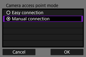 Izberite [Camera access point mode/Način fotoaparata kot dostopne točke] na zaslonu [Select a network/Izbira omrežja].