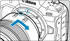 - Poravnajte rdeči namestitveni znak na objektivu z rdečim namestitvenim znakom na fotoaparatu in zavrtite objektiv, kot kaže puščica, tako da se zaskoči.
