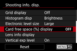 Izberite [Card free space (%) display/Prikaz razpoložljivega prostora na kartici (%)].