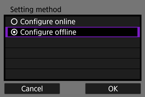 - Z izbiro [Configure offline/Konfiguracija brez vzpostavljene povezave] ostane fotoaparat nepovezan z omrežjem po izvedbi konfiguracije.