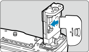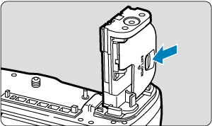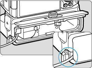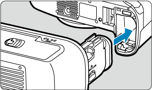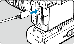 - Namestite spojnik za enosmerni tok (DC) DR-E6P (v prodaji posebej) na isti način kot bateriji.