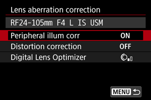 - Če uporabljate objektiv druge znamke, ki ni Canonova, priporočamo, da nastavite popravke na [Disable/Onemogoči], četudi je prikazana možnost [Correction data available/Podatki za popravek na voljo].