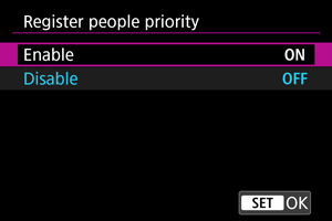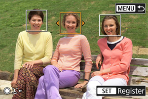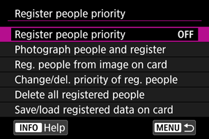 Ljudi lahko registrirate v fotoaparat, tako da fotoaparat poskuša prepoznati njihove obraze in med fotografiranjem podeliti prioriteto tem obrazom pri izostritvi ter nastavitvi svetlosti in barvnega tona. Za registracijo obraza lahko naredite posnetek določene osebe ali uporabite sliko na kartici.