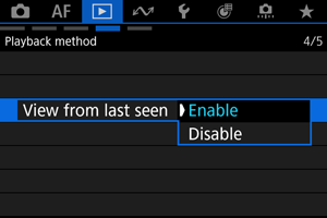- [Enable/Omogoči]: Predvajanje se nadaljuje od zadnje prikazane slike (razen če ste pravkar končali s fotografiranjem).