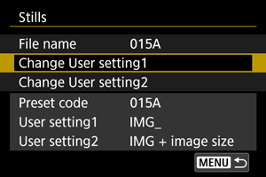 Možnost User setting 1/Uporabniška nastavitev 1 omogoča registracijo štirih znakov po vaši izbiri. Možnost User setting 2/Uporabniška nastavitev 2 doda tri začetne registrirane znake po vaši izbiri četrtemu znaku, ki predstavlja velikost slike, ki je samodejno dodan po zajemu posnetka.