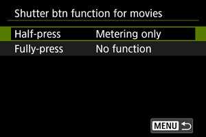 - Med snemanjem filma nastavitev [Shutter btn function for movies/Funkcija gumba zaklopa za filme] razveljavi funkcije, dodeljene gumbu zaklopa v [