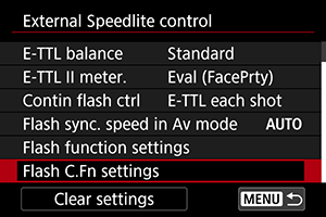 - Odaberite [Flash C.Fn settings] ili [External flash C.Fn setting].