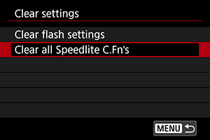Odaberite [Clear flash settings] ili [Clear settings] da biste vratili podešavanja Speedlite blica na podrazumevane postavke.