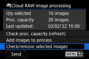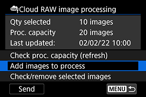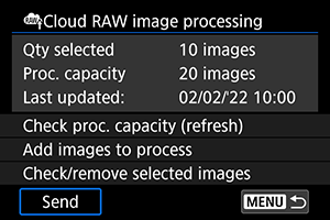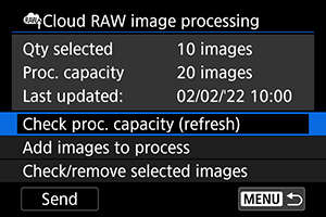 - [Proc. capacity] je [0] osim ako nemate plaćenu pretplatu za obradu RAW slika na cloud-u. Dobićete informacije o pretplati na adresu elektronske pošte koja je zapisana na image.canon ako pokušate da proverite kapacitet obrade bez pretplate.