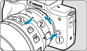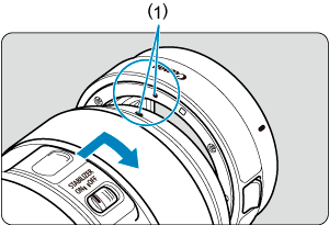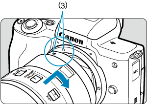 - Uravnajte bele oznake (3) na adapteru i na fotoaparatu, pa okrenite objektiv kao što je prikazano na slici tako da klikne na mesto.
