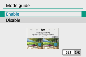 Možete izabrati da li želite da kratak opis režima za snimanje bude prikazan pri prebacivanju između režima za snimanje. Podrazumevana postavka je [Enable] / [Omog.].