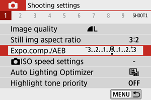 - Serijsko snimanje sa automatskom ekspozicijom se ne poništava automatski. Da biste otkazali AEB, obavite postupak u 2. koraku i isključite prikaz AEB.