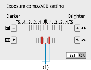- Kada podesite opseg AEB, vrednost opsega biće prikazana na indikatoru nivoa ekspozicije na ekranu.
