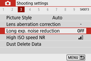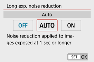 Na slikama eksponiranim 1 sekundu ili duže, fotoaparat automatski redukuje šum na slici ako prepozna šum tipičan za snimanje sa dugom ekspozicijom. Ova postavka je efikasna u većini situacija.