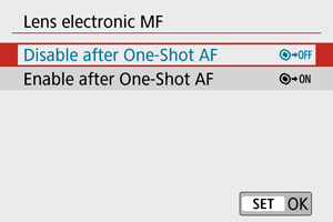 Kod EF-M, EF i EF-S objektiva sa elektronskim ručnim fokusom možete podesiti način ručnog podešavanja fokusa pri snimanju sa pojedinačnim autofokusom.