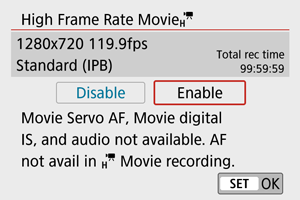 - Pošto se video zapisi sa visokim brojem kadrova snimaju kao video datoteke od 29,97 fps / 25,00 fps, biće reprodukovani usporeno pri 1/4 stvarne brzine.