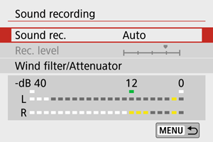 - U osnovnim režimima, dostupne postavke opcije [Sound recording] / [Snimanje zvuka] su [On] / [Uklj.] i [Off] / [Isklj.]. Izaberite [On] / [Uklj.] za automatsko podešavanje zvučnog nivoa.
