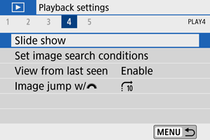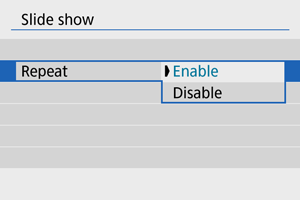 - Za fotografije, podesite [Display time] / [Vreme prikaz.], [Repeat] / [Ponovi] (ponovljena reprodukcija) i [Transition effect] / [Efekat prelaska] (efekat smenjivanja slika).