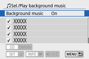 - Da biste izabrali pozadinsku muziku, koristite opciju [Background music] / [Pozadin. muzika] ().