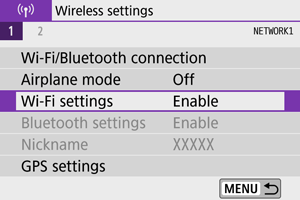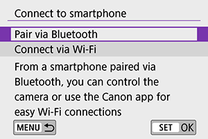 Uključite Bluetooth funkciju i Wi-Fi funkciju na ekranu sa postavkama pametnog telefona. Imajte na umu da nećete moći da uparite pametni telefon sa fotoaparatom preko ekrana sa Bluetooth postavkama na pametnom telefonu.