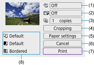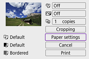 - Biće odštampan deo slike unutar okvira za obrezivanje. Možete izmeniti oblik (odnos stranica) okvira pomoću opcije [Paper settings] / [Postavke papira].