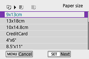 - (5)Podesite veličinu i vrstu papira i izgled strane (, , ).
