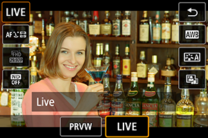 - Ako izaberete [PRVW] / [PREGL.] („Pregled“), to će vam omogućiti da isprobate strimovanje bez javnog objavljivanja slika. Ovo je korisno ako želite da proverite slike pre strimovanja.