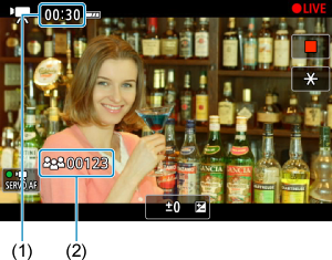 - Proteklo vreme od kada ste pritisnuli dugme za snimanje video zapisa biće prikazano na ekranu za pregled/strimovanje (1). Tokom strimovanja, takođe će biti naznačen broj gledalaca (2).