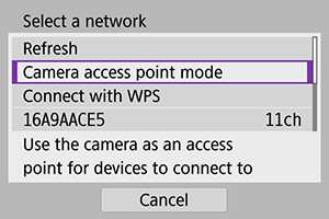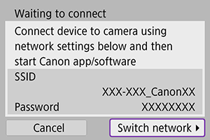 - Više informacija o poruci [Camera access point mode] / [Režim prist. tačke fotoaparata] prikazanoj u 5. koraku potražite u odeljku Režim pristupne tačke fotoaparata.