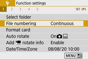 Numerisanje datoteka će se nastaviti do 9999, čak i kada zamenite karticu ili kreirate novi direktorijum. Ovo je korisno kada želite da sačuvate slike numerisane brojem u opsegu od 0001 do 9999 na više kartica ili u više poddirektorijuma u okviru jednog direktorijuma na računaru.