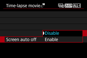 - Da otkažete snimanje ubrzanih video zapisa, podesite [Time-lapse] na [Disable].