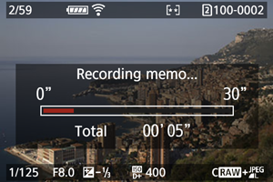 - Nastavite da držite taster nakon što poruka [Recording memo...] bude prikazana, a zatim govorite u mikrofon za snimanje glasovnih beležaka (1). Jednu belešku možete snimati do oko 30 sekundi.