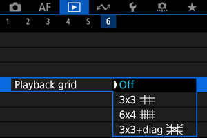 Možete prikazati pomoćnu mrežu kada je slika prikazana preko celog ekrana u režimu za reprodukciju. Ova funkcija će vam pomoći da proverite iskošenost slike u odnosu na horizontalnu i vertikalnu osu, kao i kompoziciju slike.