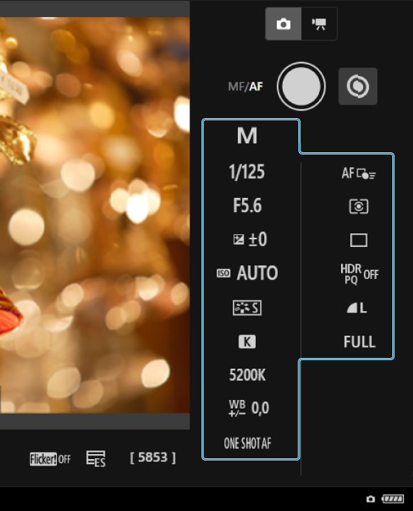 - Da biste prikazali/sakrili (28) dugme manuelnog fokusa, odaberite (5) dugme za prebacivanje manuelnog fokusa.