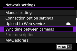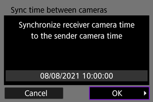 Možete poslati vreme sa otpremnog fotoaparata na do 10 prijemnih fotoaparata. Vodite računa da će čak i nakon sinhronizacije postojati manja margina greške između vremena na otpremnom i prijemnim fotoaparatima (od najviše ±0,05 sekundi).