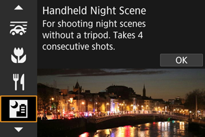 Režim [] (noćna scena pri snimanju iz ruke) omogućava snimanje noćnih scena iz ruke. U ovom režimu snimanja, četiri snimka se snimaju uzastopno za svaku sliku, a rezultirajuća slika je snimljena sa smanjenim podrhtavanjem fotoaparata.