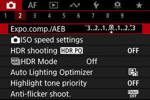 - Serijsko snimanje sa automatskom ekspozicijom se ne poništava automatski. Da biste ga poništili, obavite postupak u 2. koraku i isključite prikaz opsega AEB.