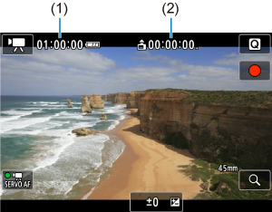 Prikazuje dostupno vreme snimanja u stanju mirovanja. Tokom snimanja, biće prikazano proteklo vreme snimanja otkako ste pokrenuli snimanje video zapisa. (1).