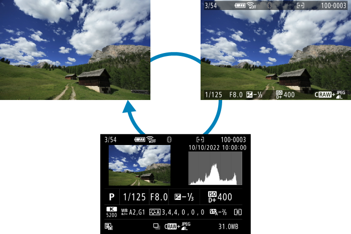 Kada ste prikazali ekran sa informacijama o snimanju (), pritisnite taster da biste prikazali ostale informacije. Možete prilagoditi prikazane podatke preko opcije [