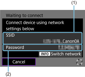 - Proverite SSID (1) i Lozinku (2) prikazane na ekranu fotoaparata.