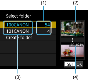- Direktorijum može sadržati do 9999 datoteka (numerisanih od 0001 do 9999). Kada se direktorijum napuni, automatski će biti kreiran novi direktorijum sa brojem za jedan većim od prethodnog. Ako ručno resetujete numerisanje datoteka (), novi direktorijum će automatski biti kreiran. Možete kreirati direktorijume numerisane od 100 do 999.