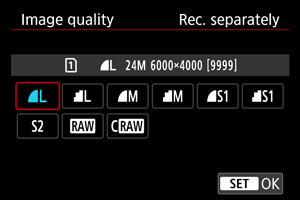 - Ako ste odabrali i RAW i JPEG/HEIF kvalitet slike, svaki put kada pritisnete okidač na kartici će biti sačuvane dve verzije slike u odabranom kvalitetu. Obe slike će imati isti broj datoteke, ali će se razlikovati po ekstenziji (.JPG za JPEG slike, .HIF za HEIF slike i .CR3 za RAW slike).