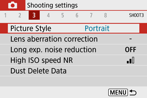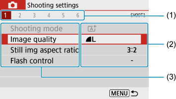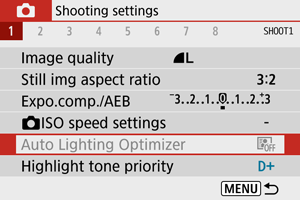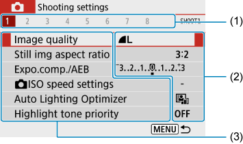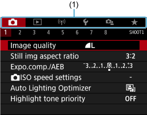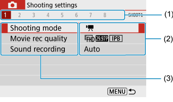 Kartice u meniju i prikazane stavke se razlikuju u zavisnosti od režima snimanja.